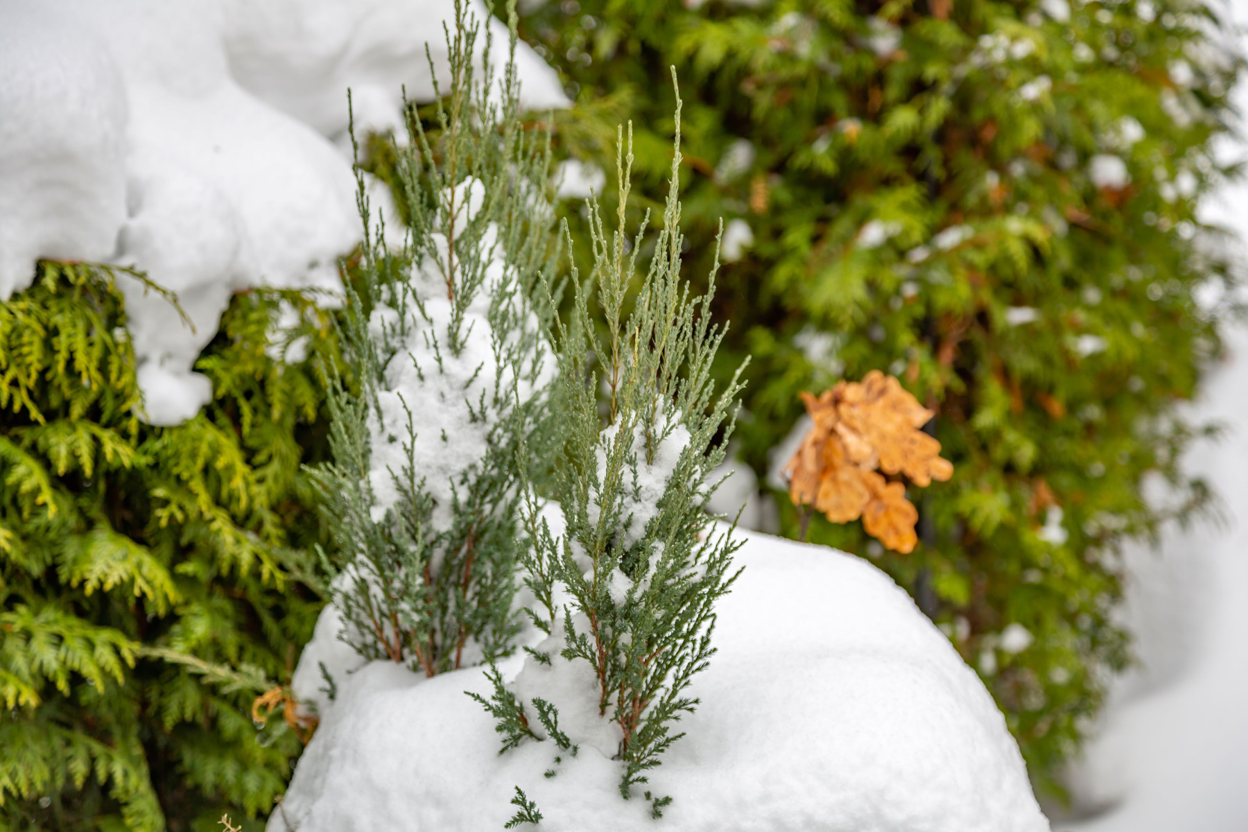 Проверьте состояние деревьев и кустарников под снегом. При обильных снегопадах аккуратно стряхивайте снег с веток, чтобы предотвратить их поломку. Снег с теплицы также стоит убрать, а под растения, наоборот, набросать для дополнительной защиты от морозов. Лучше всего делать это в морозную погоду, когда снег рассыпчатый.