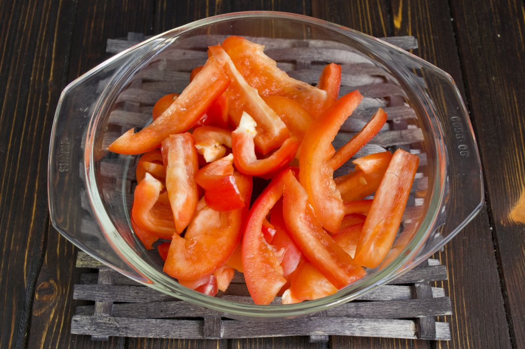 Из красного сладкого перца вырезаем семена, затем тщательно промываем перец под краном, чтобы остатки семечек в соус случайно не попали. Нарезаем мякоть толстыми полосками. Кстати, для этого рецепта используйте только зрелые и мясистые овощи, можно немного перезрелые, но без признаков порчи.