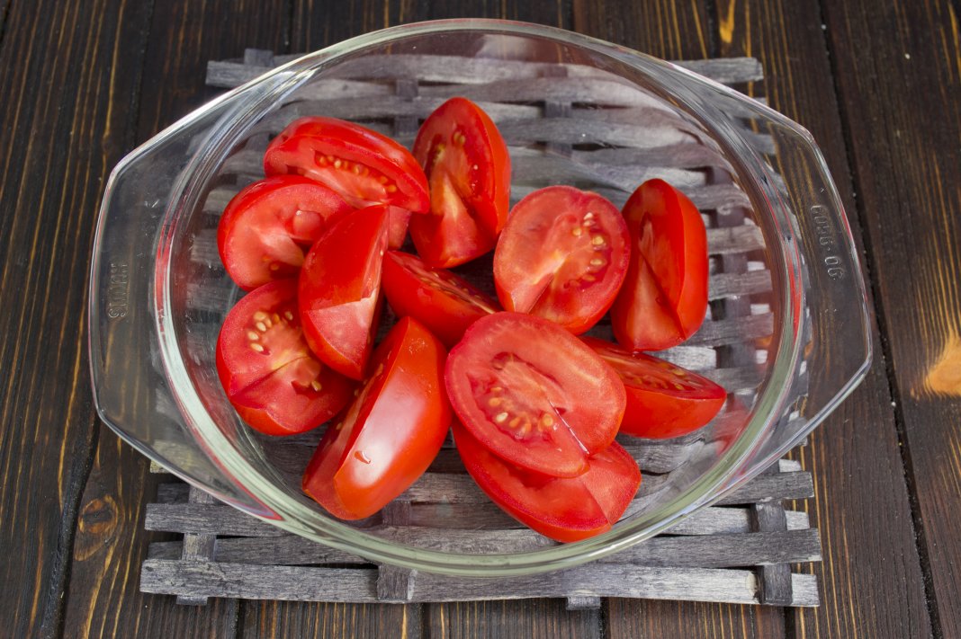 Помидоры разрезаем пополам, вырезаем плодоножку. Если томаты крупные, то режем их на четыре части, чтобы приготовились быстрее.