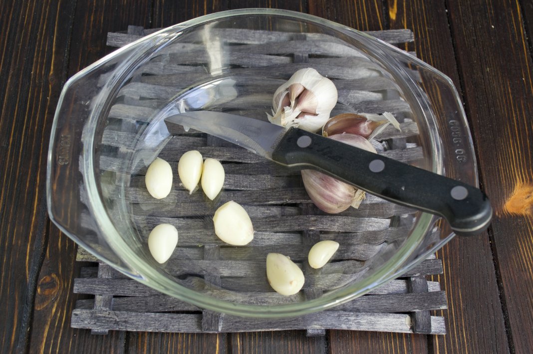Чистим от шелухи головки чеснока. Быстро очистить их удобно таким способом – кладём головку чеснока на разделочную доску, сверху плоской стороной — широкий нож. Ударяем по нему сильно рукой. Разделившиеся зубчики перекладываем в банку или металлическую ёмкость с крышкой, сильно трясём примерно полминуты. В результате этих манипуляций шелуха легко отлетает от долек.
