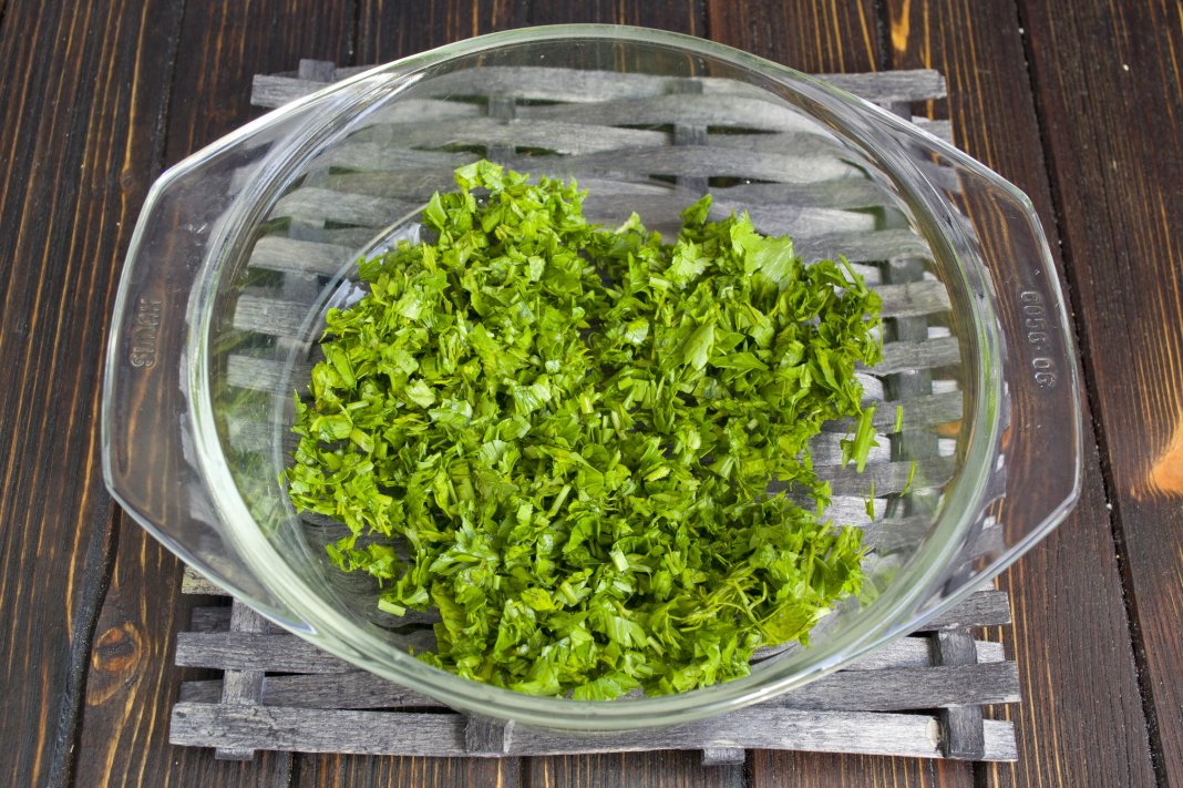 Пучок петрушки кладём в холодную воду, промываем под краном, ополаскиваем кипятком, рубим мелко.