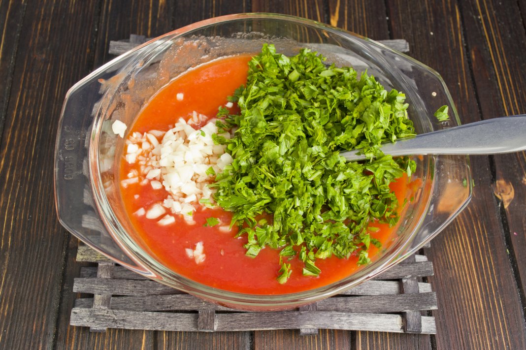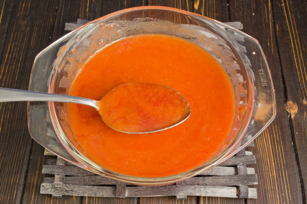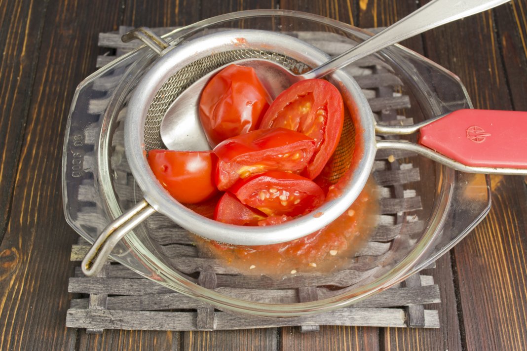 Когда все ингредиенты подготовлены, приступаем к приготовлению. Томаты распариваем на пару 15 минут, перекладываем в редкое сито, протираем ложкой.