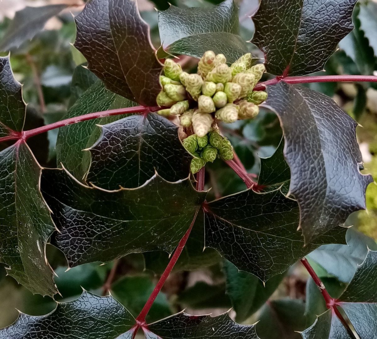 Ну и ладно, значит, можно особо с кустом не возиться. Магония быстро почувствовала, что навязчивой заботы больше не будет, взбодрилась и активно тронулась в рост. На верхушках всех побегов заложила пригорошни цветочных почек. Цветочные почки у магонии очень симпатичные. Округло-заострённые, многочисленные, образуются к зиме и в таком виде красуются до весны.