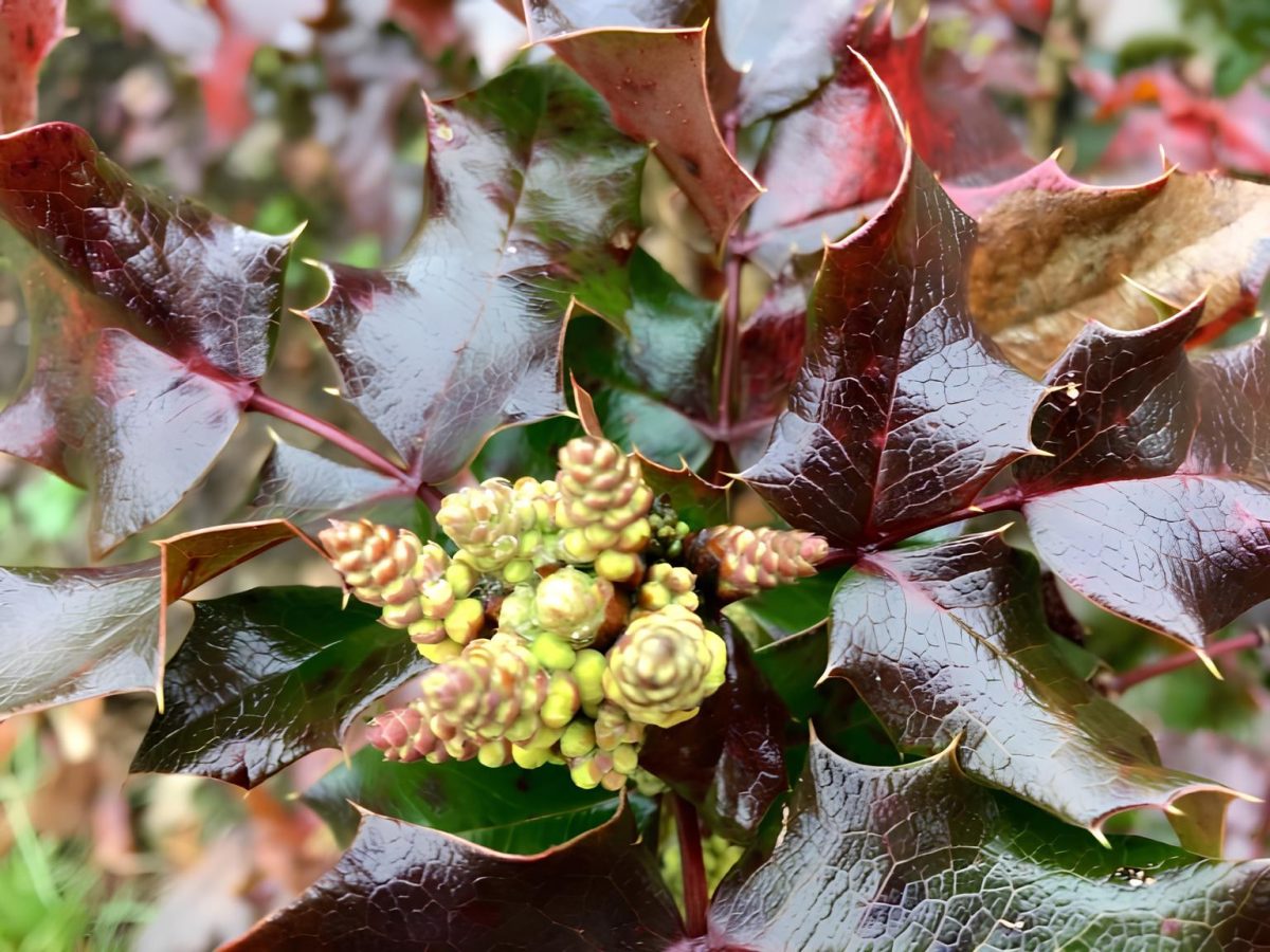 Магония на зиму листья не сбрасывает, но принимает меры к тому, чтобы без ущерба пережить морозы. Листья и стебли к зиме приобретают красноватые оттенки, накапливают антоцианы и сахара в качестве криопротекторов.
