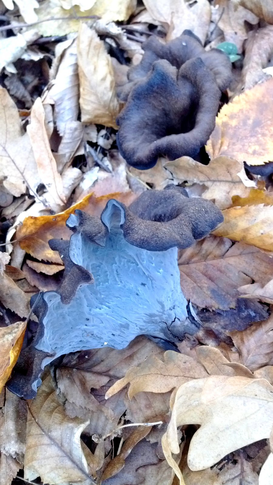 Зря не взяла сразу. Чёрная лисичка (Вороночник рожковидный) – один из самых вкусных грибов. Обнаружила я эти грибы в августе и росли они, путаясь под ногами, до середины декабря. Морозов заметных не было, ночные (-5) они легко переживали под листвой.