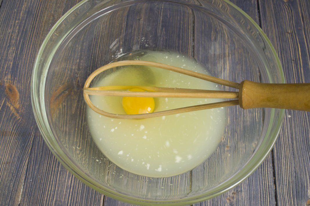 Разбиваем в миску куриные яйца, перемешиваем продукты венчиком до однородности.