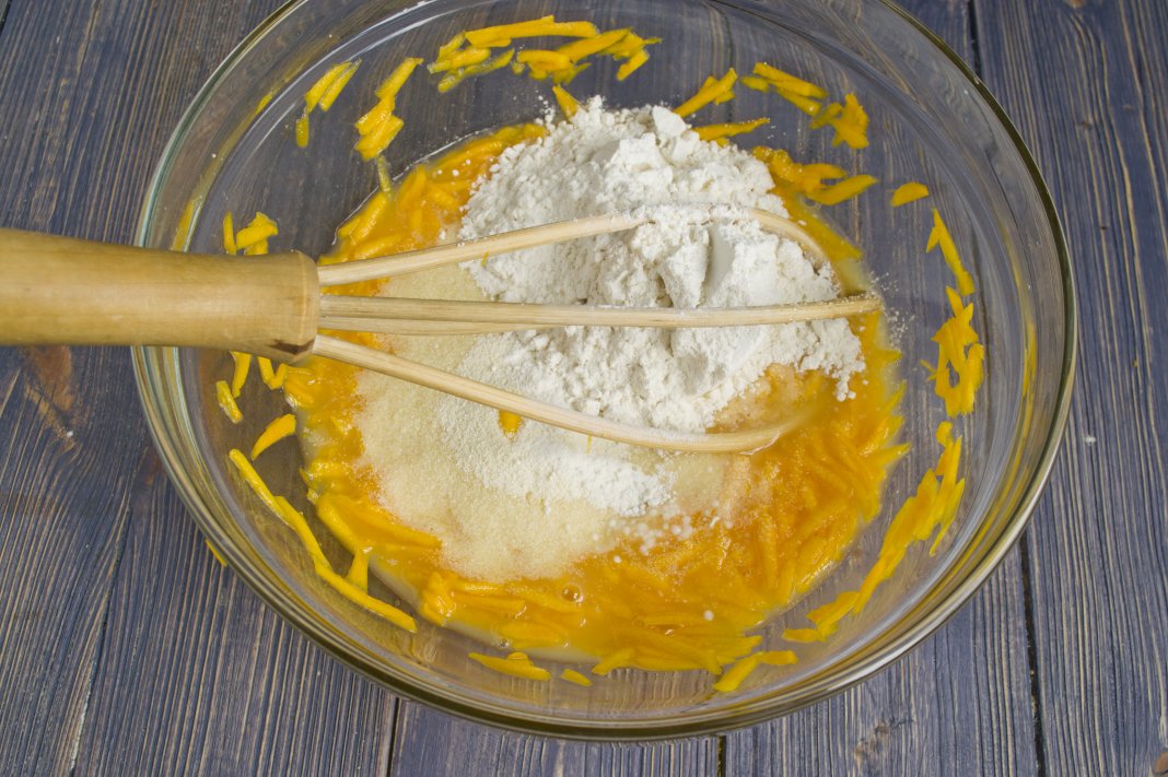 Смешиваем разрыхлитель теста с пшеничной мукой, просеиваем, добавляем к остальным ингредиентам. Чтобы приготовить не только вкусное, но и полезное блюдо, замените обычную рафинированную муку цельно зерновой, а белый сахар — коричневым.