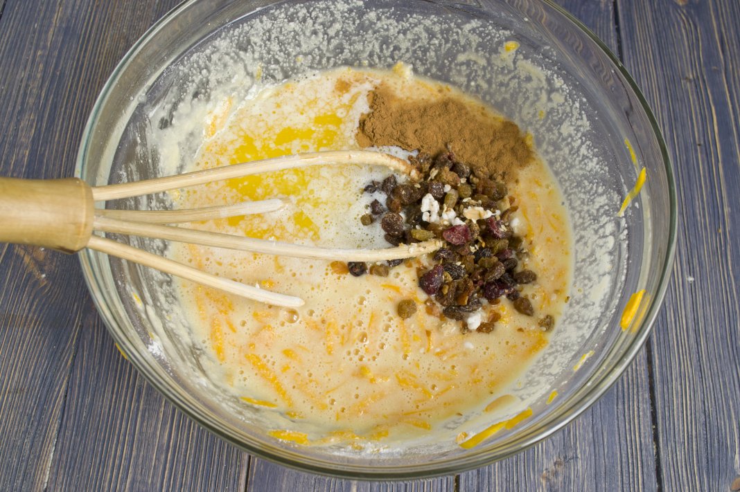 Сливочное масло растапливаем в сотейнике, остужаем. Добавляем в миску растопленное масло, молотую корицу и сухофрукты. Для разнообразия текстур, кроме сухофруктов, можно положить в тесто мелко порубленные грецкие орехи, тыквенные семечки или семечки подсолнуха.
