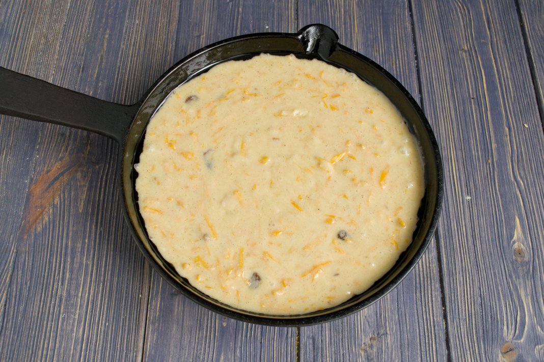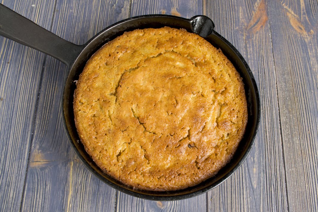 Нагреваем до температуры 185 градусов Цельсия духовой шкаф. Сковороду ставим в центр духовки на средний уровень. В зависимости от индивидуальных особенностей плиты, готовим 35-40 минут. Готовность проверяем лучинкой — на ней не должно остаться следов теста.