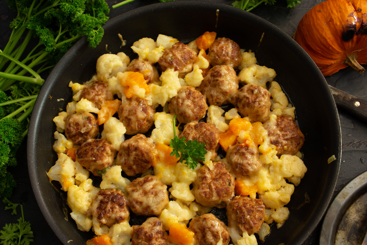 Подаём митболы с цветной капустой и тыквой запеченные в духовке на стол горячими, перчим свежесмолотым перцем, украшаем зеленью. Приятного аппетита!