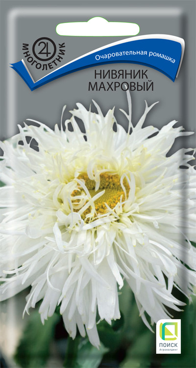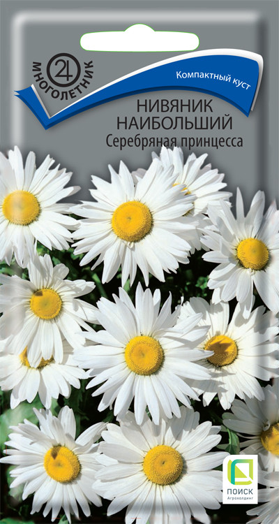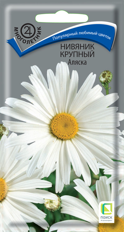 Нивяник «Серебряная принцесса», «Махровый», «Аляска» – один из самых популярных многолетников в России. Крупные цветки с белыми широкими лепестками и жёлтой серединой достигают в диаметре 6-10 см в зависимости от сорта. Также варьируется высота растений: Серебряная принцесса – 40 см, Махровый – 60-70 см, Аляска – 70 см. Обильное цветение в июне-июле. Используется для групповых посадок в цветниках, рядами на рабатки. Идеально подходит для срезки, сохраняет свою декоративность в воде до 10 дней.