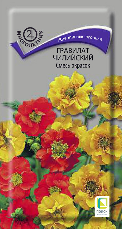Гравилат чилийский «Смесь окрасок» – живописные миниатюрные огоньки цветов над пышной зеленью! Растения высотой около 60 см. Листья непарноперистые, сочно-зелёного цвета. Цветы красные и жёлтые, в рыхлом метельчатом соцветии. Цветение в июне-августе. К почве не требователен. Используют в смешанных бордюрах, группами.