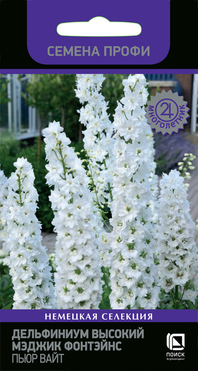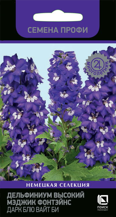Дельфиниум высокий Мэджик Фонтейнс «Лавендер Вайт Би», «Пьюр Вайт», «Дарк Блю Вайт Би» – популярный многолетник с богатым цветением! Высота растения 90-120 см. Цветки полумахровые, диаметром 5-6 см. Цветоносы прочные, собраны в длинные конусовидные соцветия (до 50 см). Окраска разнообразная. Используют для создания заднего плана цветников и на срезку. Предпочитает солнечное место, хорошо растёт на питательных и умеренно влажных почвах.