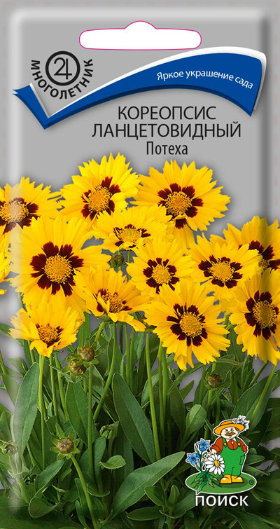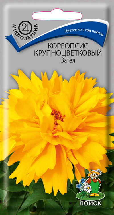 Кореопсис «Затея», «Потеха» – многочисленные яркие золотисто-жёлтые соцветия! Растение образует ветвистый куст высотой 40 см. Сорта отличаются соцветиями. Затея – цветки махровые, однотонные, Потеха – цветки немахровые, широко открытые, с тёмным центром. Цветение пышное, продолжительное. За счёт компактного роста будет отлично смотреться на переднем крае рабаток. Рекомендуется для групповых посадок.
