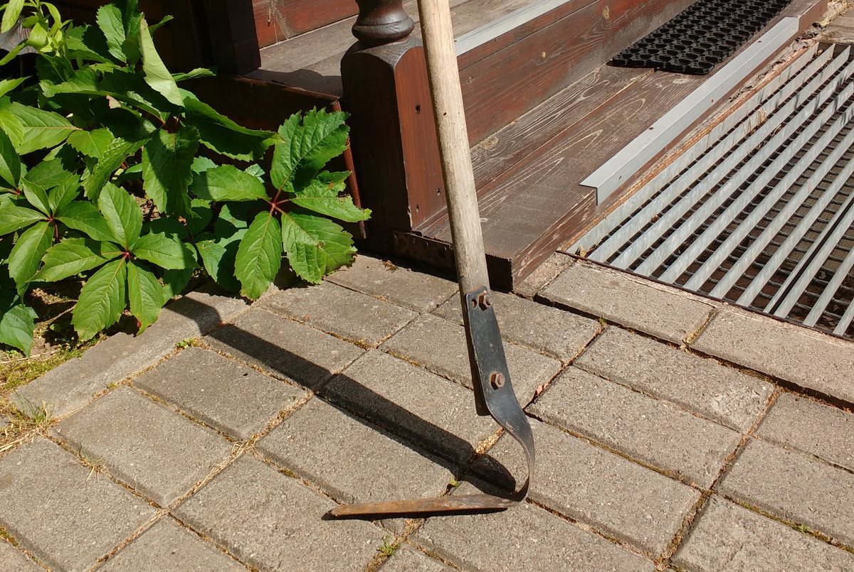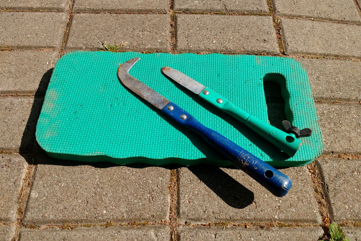 Плоскорез позволяет работать стоя, им удобно удалять не только сорняки из щелей, но и землю, скопившуюся у бордюров. Справляется инструмент и со мхом, поселившемся на плитке и в швах. Не надо ползать на коленках, работаешь стоя. Но не любую растительность плоскорезом или руками можно удалить, и не везде. Тогда приходится работать специальным ножом, которым проще извлечь из щелей и стыков особо упрямую растительность. Также с ножом больше шансов подцепить растение с корнем.