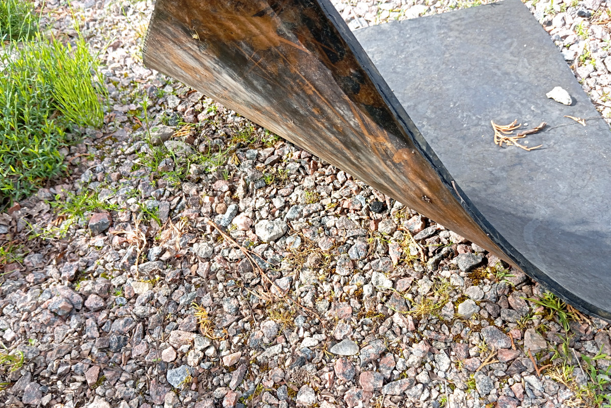 Резиновые коврики или просто куски резины выручают, когда времени на всё не хватает. Подойдёт любая резина или старые автомобильные коврики. Неплохо вытесняет траву чёрная плотная плёнка, но резиновые коврики мобильнее, и их не надо крепить. Раскладываю их у входов в теплицу и на гравийную отсыпку в каменистом садике. Под чёрным резиновым укрытием растения преют и сгорают, особенно быстро в жару. Резина сильно нагревается на солнце, уничтожая под собой растительность.