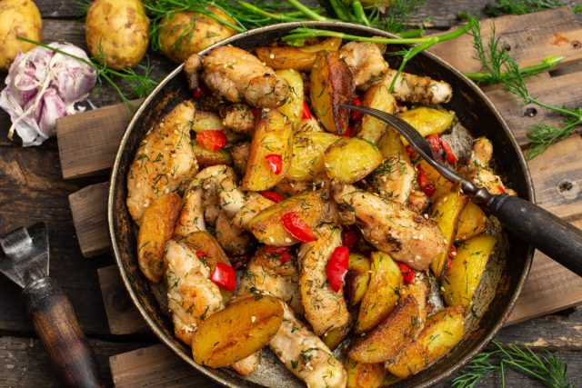 Способ приготовления молодой картошки жареной с курицей, чесноком и укропом
