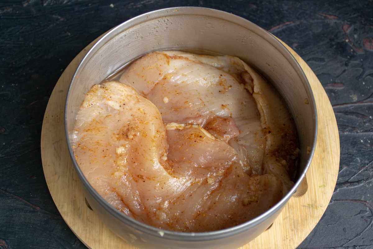 Куриное филе разрезаем вдоль пополам, посыпаем сухой приправой, выдавливаем зубчик чеснока, солим и перчим. Втираем приправы в мясо, оставляем на 10 минут в холодильнике, чтобы маринад лучше впитался. Можно оставить курицу в маринаде на ночь, будет только вкуснее.