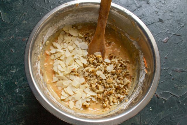 Мелко рубим грецкие орехи. Добавляем в тесто рубленые орехи и миндальные лепестки. Кстати, если не полениться, и подсушить орехи в горячей духовке, их аромат многократно усилится.