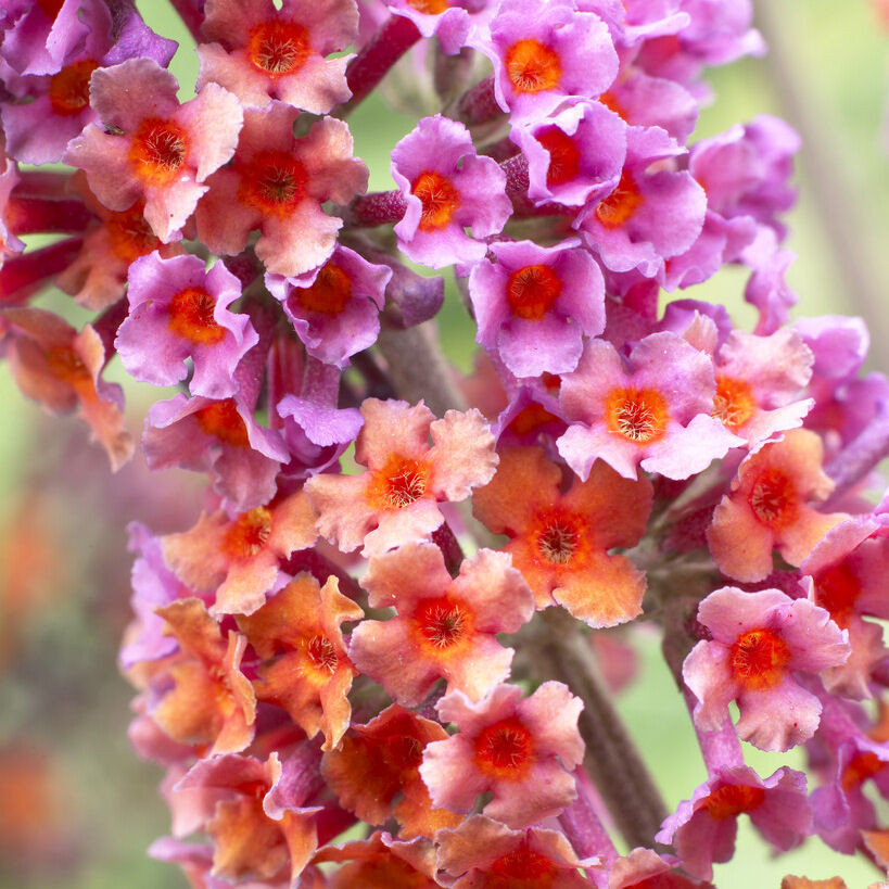 - «Флауэр Пауэр» (‘Flower Power’) — 2х1,5-2 м с трехцветными оранжево-розово-сиреневыми соцветиями и серебристо-зеленой листвой,