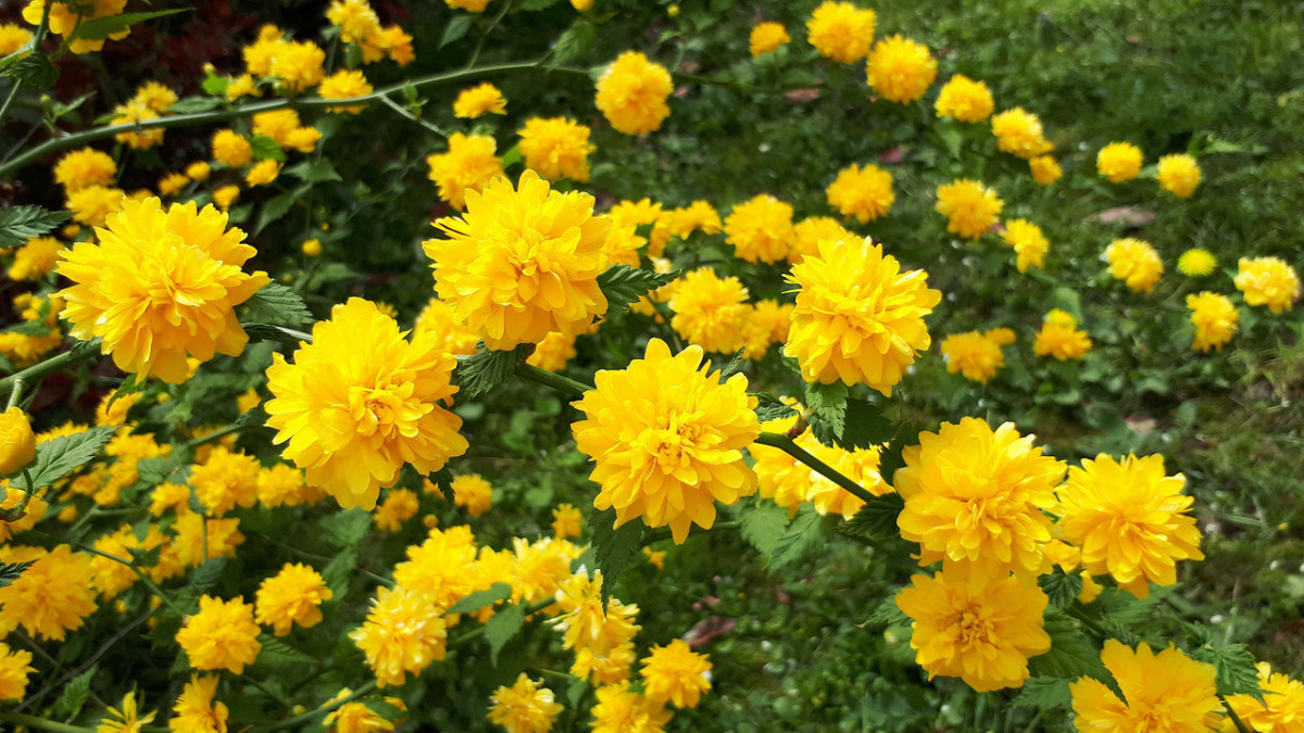 Керрия японская отличается не только богатым, но и длительным цветением – до 5 недель. Цветы первой и основной волны украшают кустарник в мае-июне в средней полосе, а в более южных регионах полюбоваться цветущей керрией можно с апреля. Летом и осенью часто происходит повторное цветение, но более скромное. В конце сезона листва желтеет.