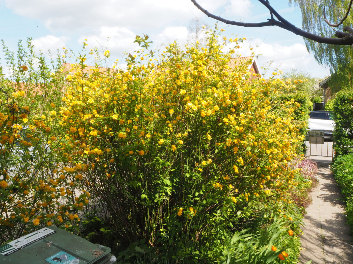 Керрия японская (kerria japonica) родом из Японии, Китая и Кореи, где произрастает в лесистой и горной местности. Видовое растение достигает в высоту 1,2 м при ширине куста до 2,5 м. Цветки солнечно-желтые, простые. Гибкие дугообразно поникающие побеги выделяются нежно-зеленым цветом.