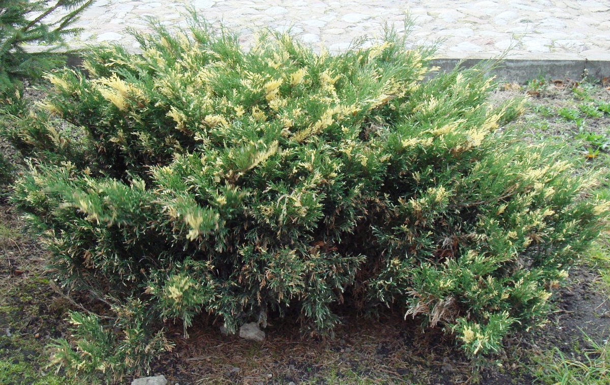 - «Variegata» — одна из базовых декоративных форм. Очень компактный и плотный можжевельник. При высоте в 1 м ограничивается 150-ю см в диаметре. Растет очень медленно, побеги распластываются параллельно почве в своеобразной воронке, причудливо изгибаясь на концах дугами. Беловатая кора сочетается с яркими чешуйками, на части ветвей окрас светло-желтый, что придает растению эффект некоторой пестроты. Растение выглядит достаточно светлым на фоне обычных можжевельников.