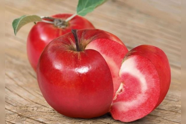 Розовый цвет в яблочной мякоти встречается не так уж и редко: он может присутствовать в виде розовых прожилок, например, у сортов «Аромат Уктуса», «Брянское Алое», «Красная Горка». Может присутствовать под кожицей, как у сорта «Вильямс Прайд». Мякоть может быть почти полностью розовой: нежно-розовая у сорта «Весялина» и насыщенно-розовая у яблок сортов «Байя Мариса», «Редлав Одиссо», «Ред Кэтти».