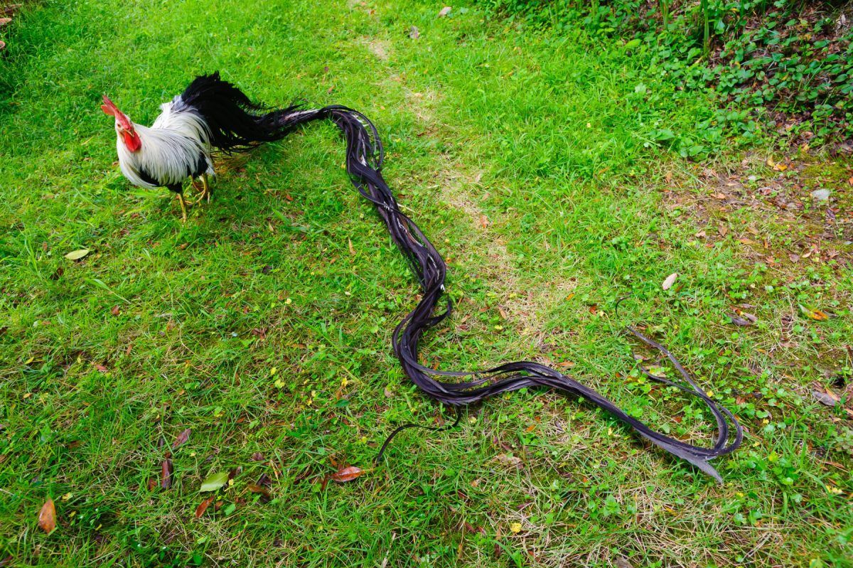 С хвостом в несколько метров. Да, серьёзно, метров. Правда, чтобы такой хвост отрастить, нужны условия: высокие насесты, идеальная чистота. Иначе хвост по земле волочится и превращается в мочалку. Зато если всё правильно сделать, красота неземная.
