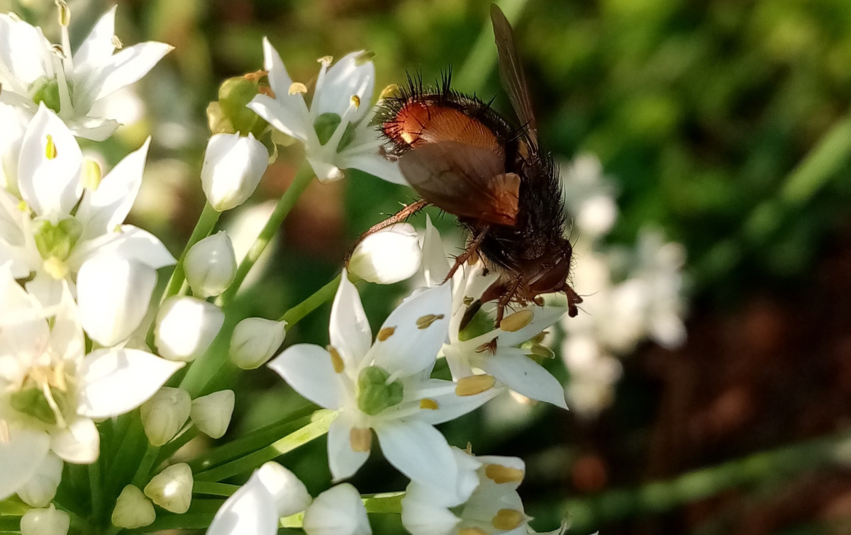В нашем саду в зиму приствольные круги плодовых уходят укрытые листовым опадом. У долгоносиков и гусениц плодожорок, которые там наверняка есть, шансов пережить зиму не так много. В подстилке до холодов будут активно кормиться хищные жужелицы, да и мухи-тахины (ежемухи) наверняка уже пооткладывали свои яйца на гусеничек и на долгоносиков. Отродившиеся личинки мух будут кормиться этими гусеницами и долгоносиками — они паразиты. Кстати, у нас ежемухи облюбовали лук джусай, взрослые насекомые там питаются нектаром. Лук растёт вблизи колоновидных яблонь.