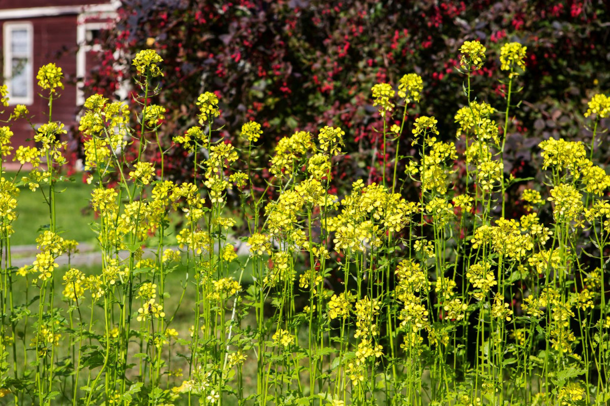 Красивую салатную горчицу — кружевную зелёную и гофрированную краснолистную мы сажаем по периметру картофельного участка. То, что не съелось, и не заготовилось (зелёная аджика) идёт в дополнение к травяной мульче между кустами картофеля. Несколько растений по углам оставляем процвести и на семена. Цветущая и плодоносящая горчица начинает сдерживать рост картофеля, так что только — по углам.