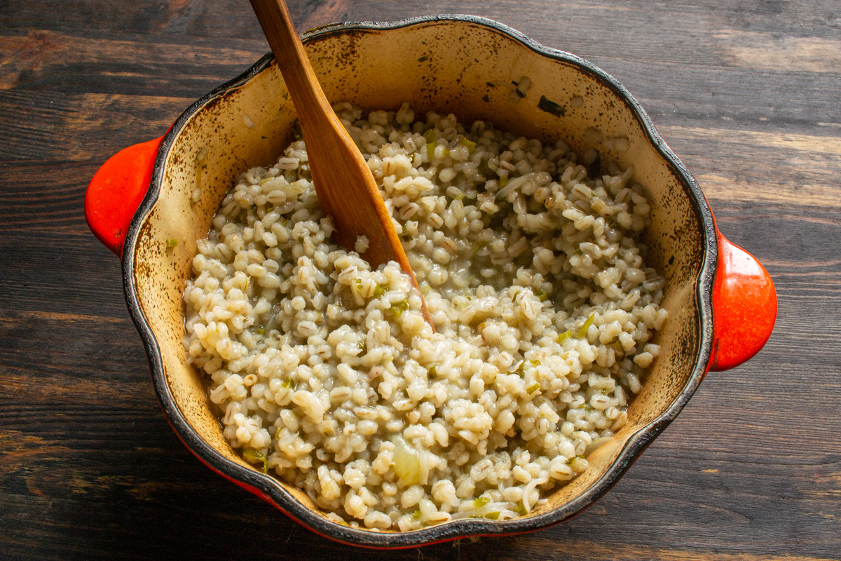 В отличие от круглого риса перловая крупа так быстро не разваривается. Я рекомендую накрыть кастрюлю крышкой, уменьшить огонь и дать перловке потомиться примерно 30 минут, добавляя по мере необходимости бульон. Готовое ризотто из перловки похоже на обычное – ощутимые зернышки в кремовой, сливочной подливе.