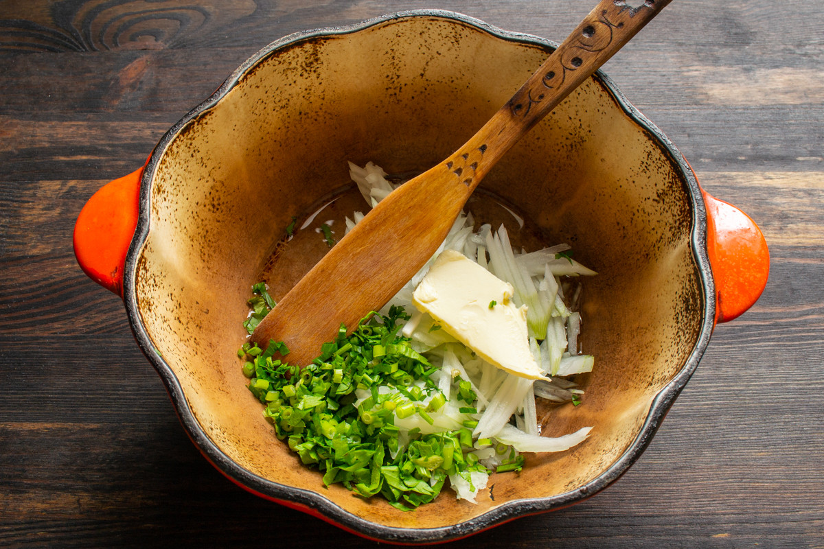 Мелко режем репчатый лук. Измельчаем стебли сельдерея вместе с зеленью, давим зубчик чеснока. В толстостенную кастрюлю наливаем оливковое масло. Кладем сливочное масло, нарезанный лук, чеснок, сельдерей. Масло не жалейте, в этом рецепте чем больше, тем лучше.