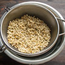 Размоченную перловую крупу откидываем на сито, даем стечь воде. Можно выложить перловку на бумажные полотенца, чтобы она лучше обсохла.
