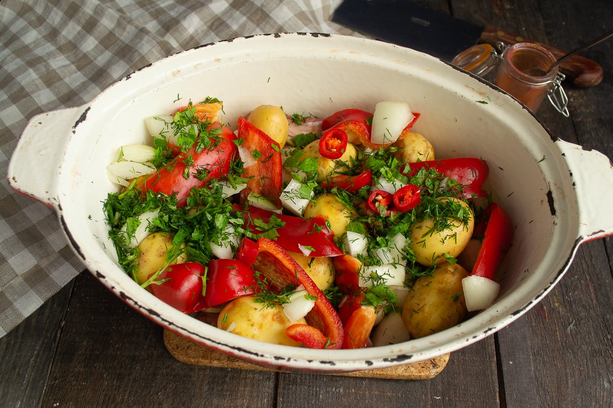 Далее добавляем картофель. В этом рецепте молодая картошка, поэтому она отправилась в жаровню целиком. Ранний картофель даже чистить необязательно, достаточной вымыть щеточкой.