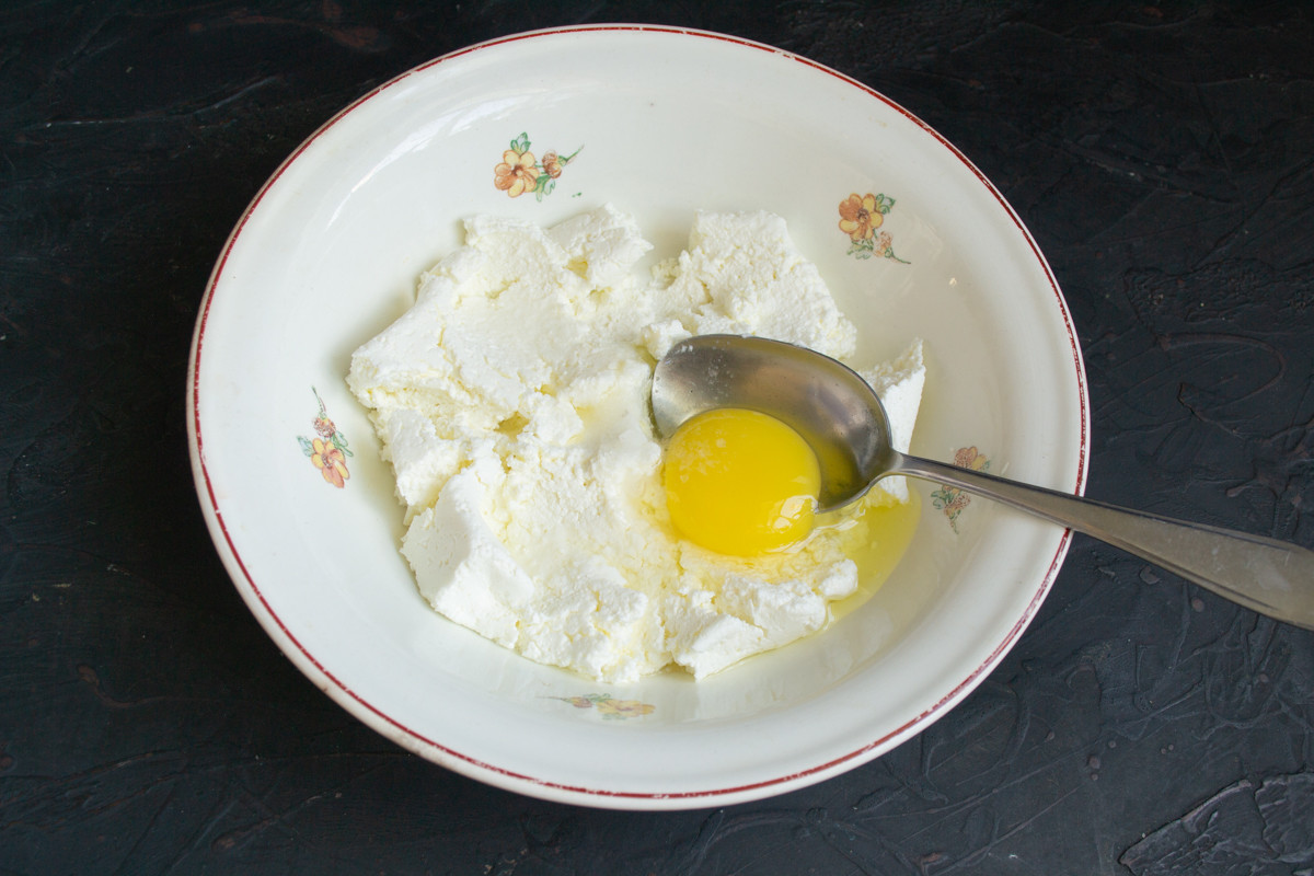 Делаем тесто для нежных сырников. К 5%-му творогу добавляем крупное куриное яйцо, щепотку мелкой соли и сахарный песок.