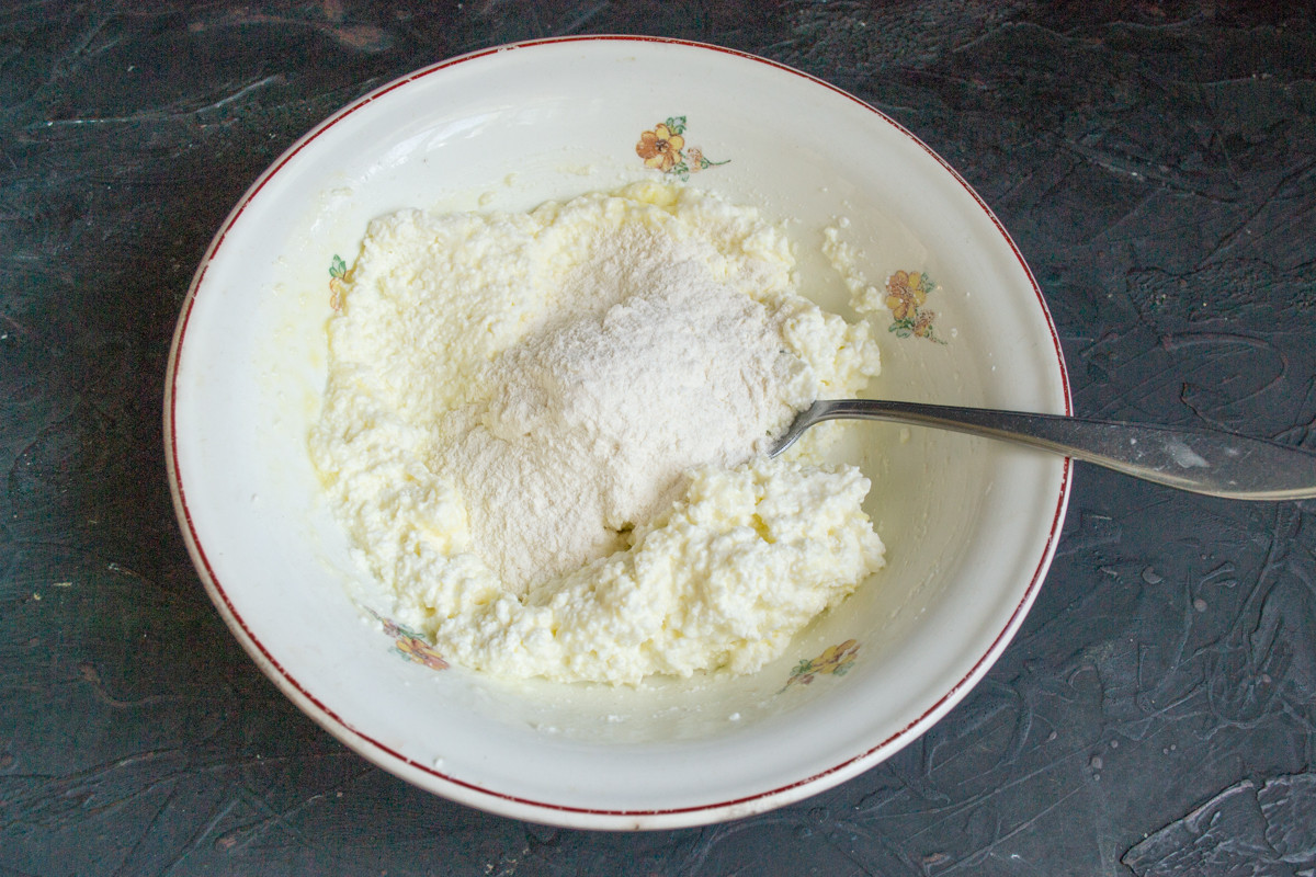 Тщательно растираем творог с яйцом, солью и сахаром, насыпаем пшеничную муку, достаточной одной столовой ложки с маленькой горочкой.
