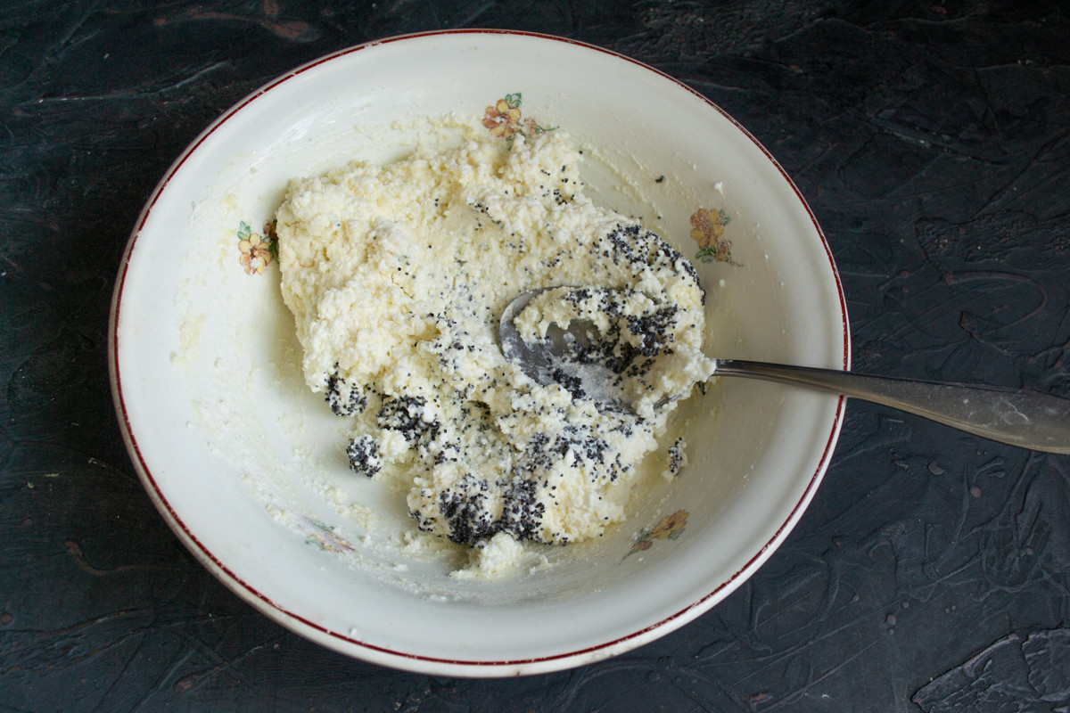 Насыпаем сухой мак, хорошенько перемешиваем ингредиенты, и наше тесто готово.
