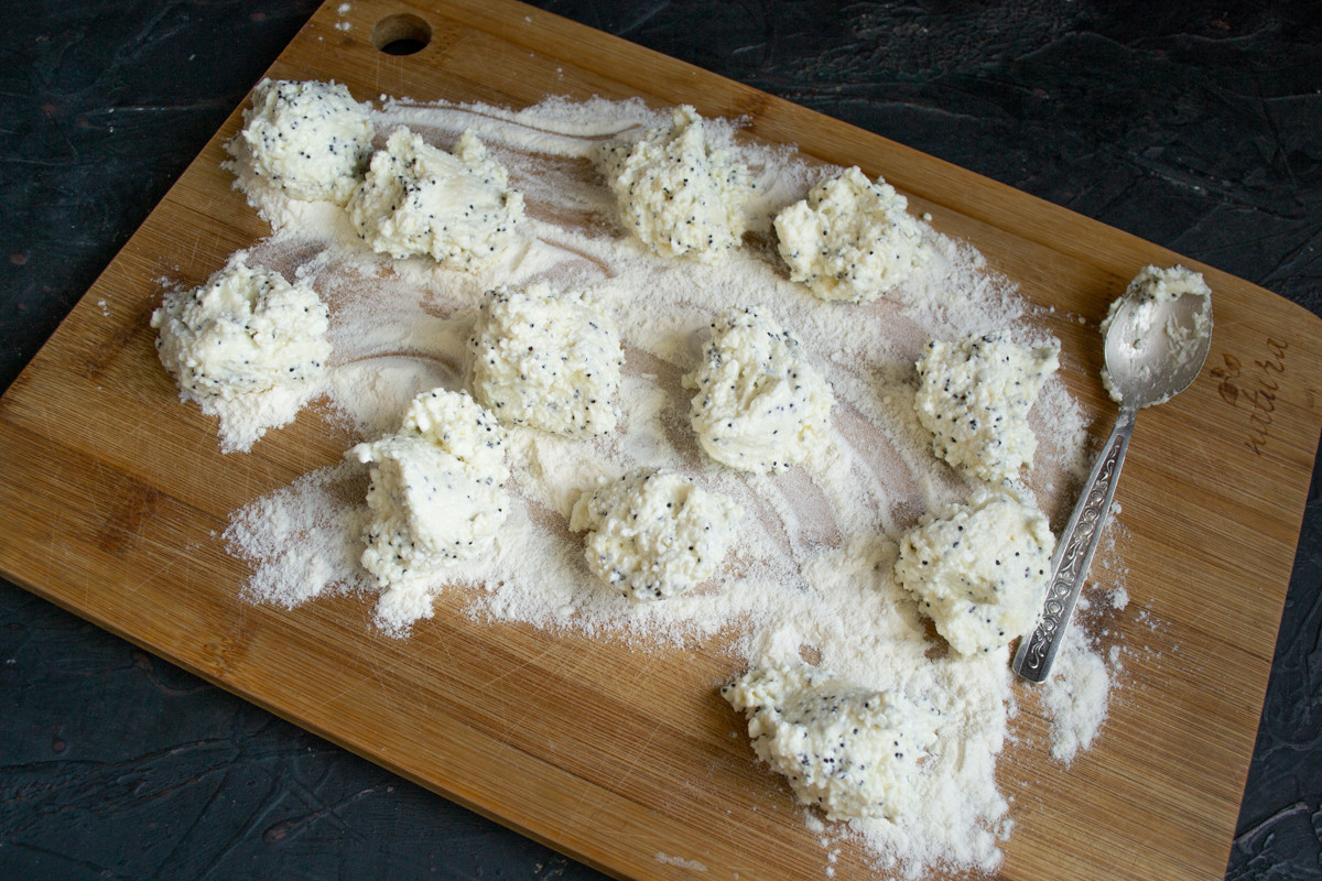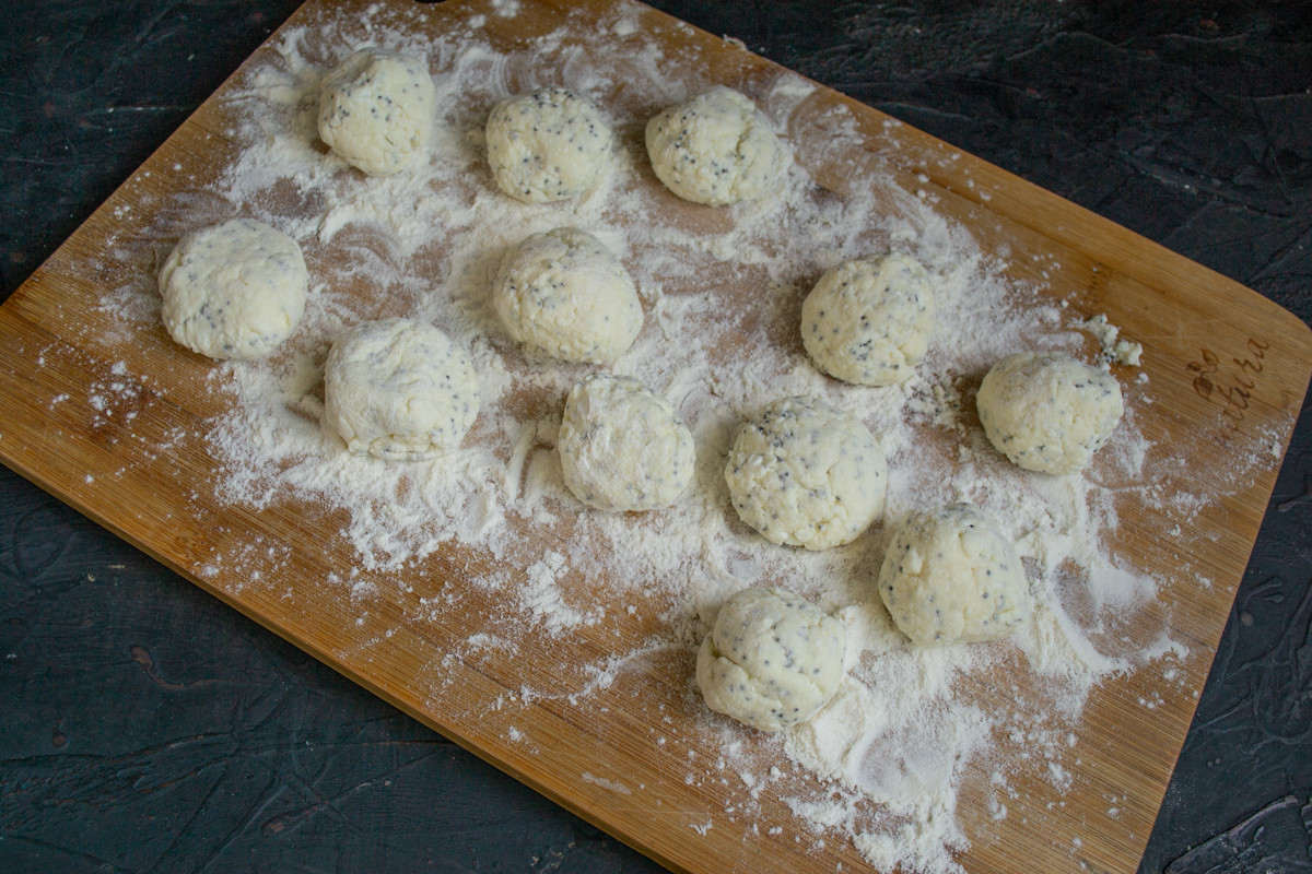 Панируем тесто в муке, чтобы не липло и скатываем небольшие шарики руками.