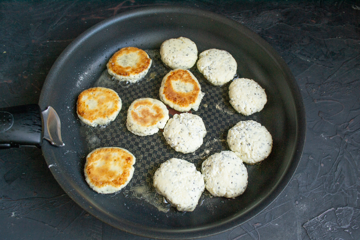 Антипригарную сковороду сбрызгиваем рафинированным растительным маслом, выкладываем сырники, расплющиваем лопаточкой, чтобы получились круглые лепешки. Жарим по 4 минуты с каждой стороны.