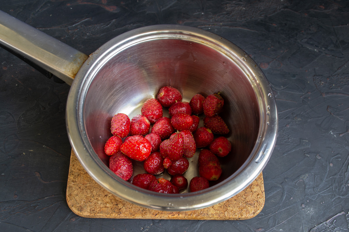 Готовим клубничный соус. Обрываем чашелистики с ягод, тщательно промываем, кладём в сотейник.
