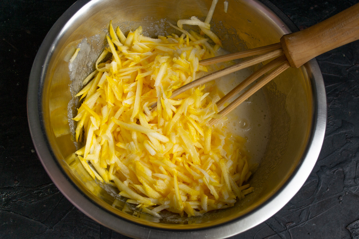 Взбиваем несколько минут яйца с сахаром, пышная пена не нужна, взбиваем до тех пор, пока не растают крупинки сахара, затем добавляем тёртый кабачок.