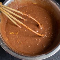 Добавляем пшеничную муку и несладкий порошок какао, насыпаем разрыхлитель теста. Разрыхлитель теста можно заменить содой и уксусом. 2 чайные ложки яблочного уксуса добавить к жидким ингредиентам, а 1/2 чайной ложки соды смешать с мукой.