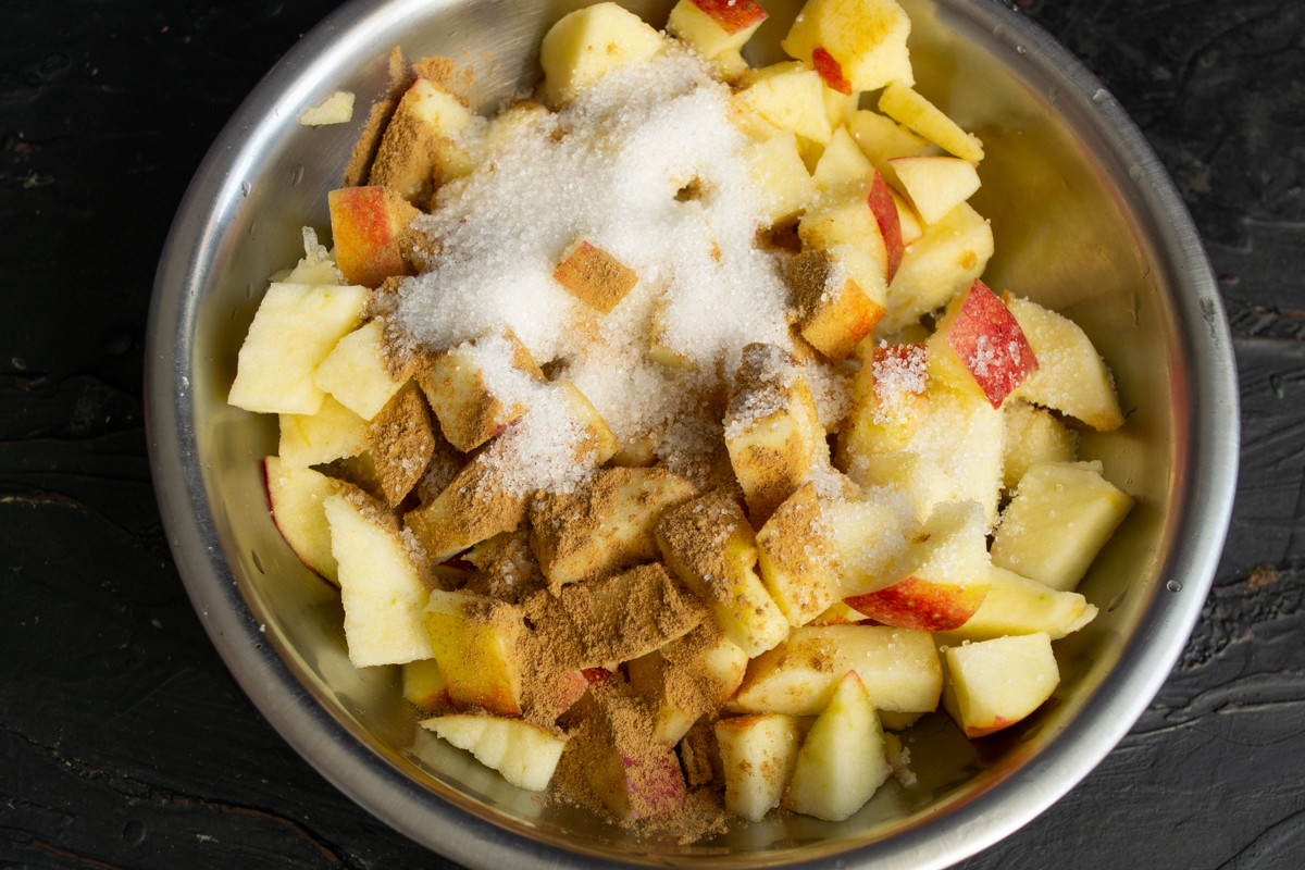 Вырезаем серединки из яблок, режем яблоки небольшими кубиками, посыпаем сахаром и молотой корицей, перемешиваем.
