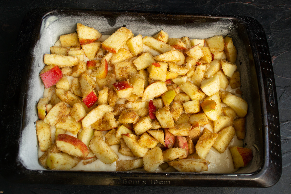 Примерно половину теста выливаем в форму. Наклоняем форму, чтобы тесто растеклось ровным слоем. По толщине слой получится не больше сантиметра, так и должно быть, в этом пироге главная роль у яблок! На тесто выкладываем яблоки с сахаром и корицей так, чтобы они заполнили всю форму, если не хватает, то советую дорезать ещё.