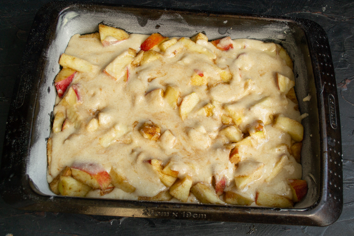 Столовой ложкой хаотически выкладываем оставшееся тесто на фрукты. Яблоки полностью не скроются, пусть так и будет, в процессе выпечки тесто поднимется, и почти вся начинка спрячется.