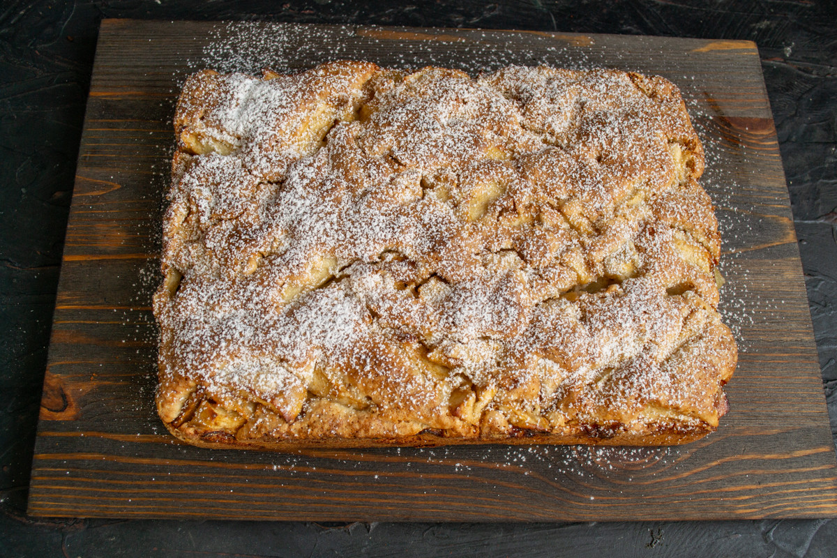 Остужаем пирог в форме 15 минут, затем достаём и посыпаем сахарной пудрой через сито.