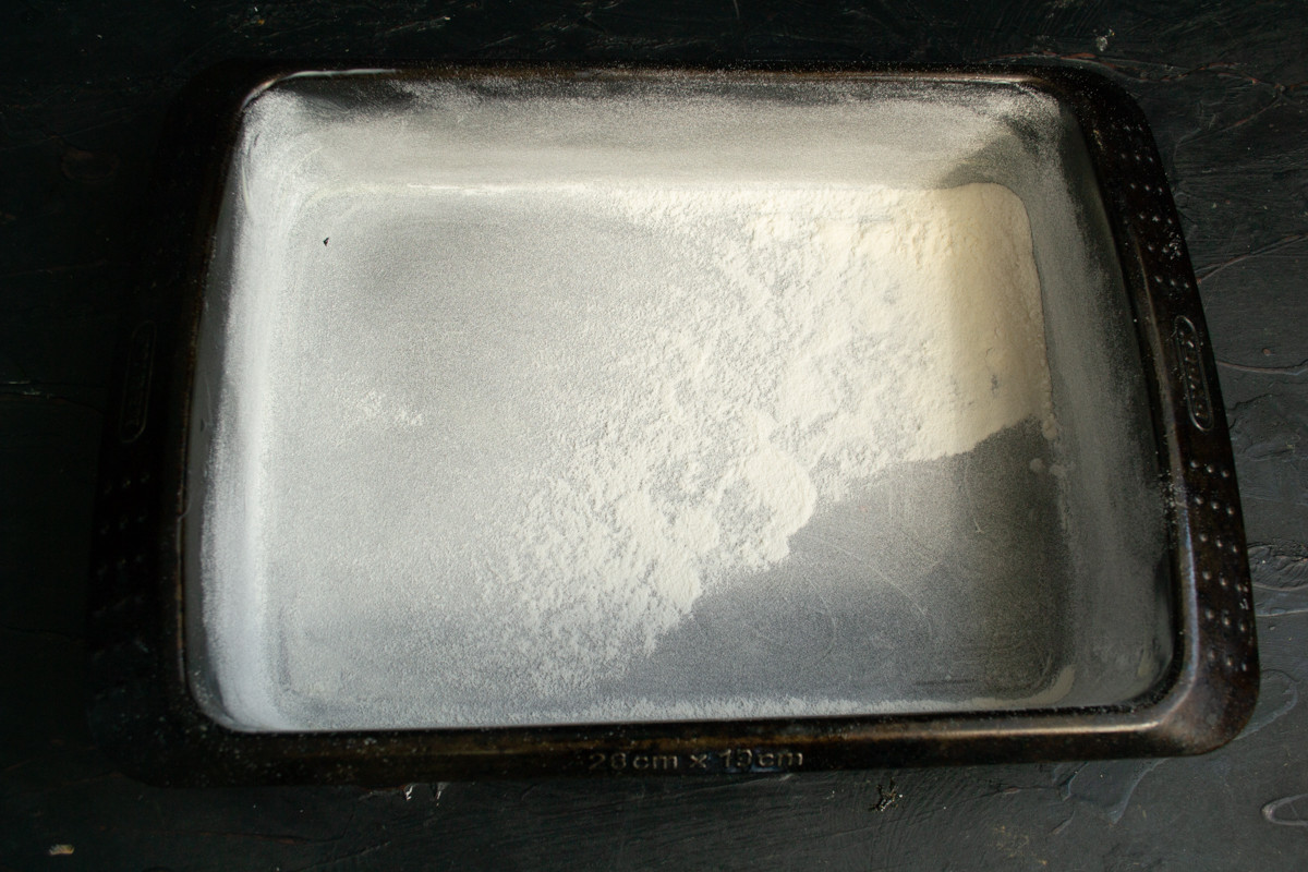 Форму смазываем мягким сливочным маслом, обильно посыпаем мукой, чтобы не осталось не укрытых мест. Излишек муки стряхиваем – если по углам застрянет мука, то там она и останется, прилипнув к пирогу, это не вкусно и не аппетитно выглядит.
