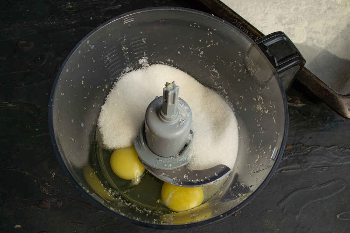 Насыпаем в чашу блендера сахарный песок, щепотку мелкой соли чтобы сбалансировать сладость, разбиваем куриные яйца.