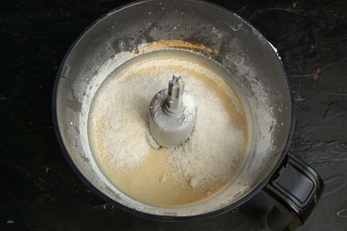 Добавляем в тесто имбирный порошок и кокосовую стружку (важно мелкую!), ещё раз всё хорошо перемешиваем. По консистенции готовое тесто похоже на все ту же сметану, то есть довольно жидкое, но как вода не плещется.